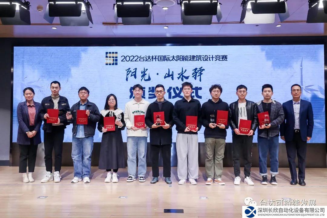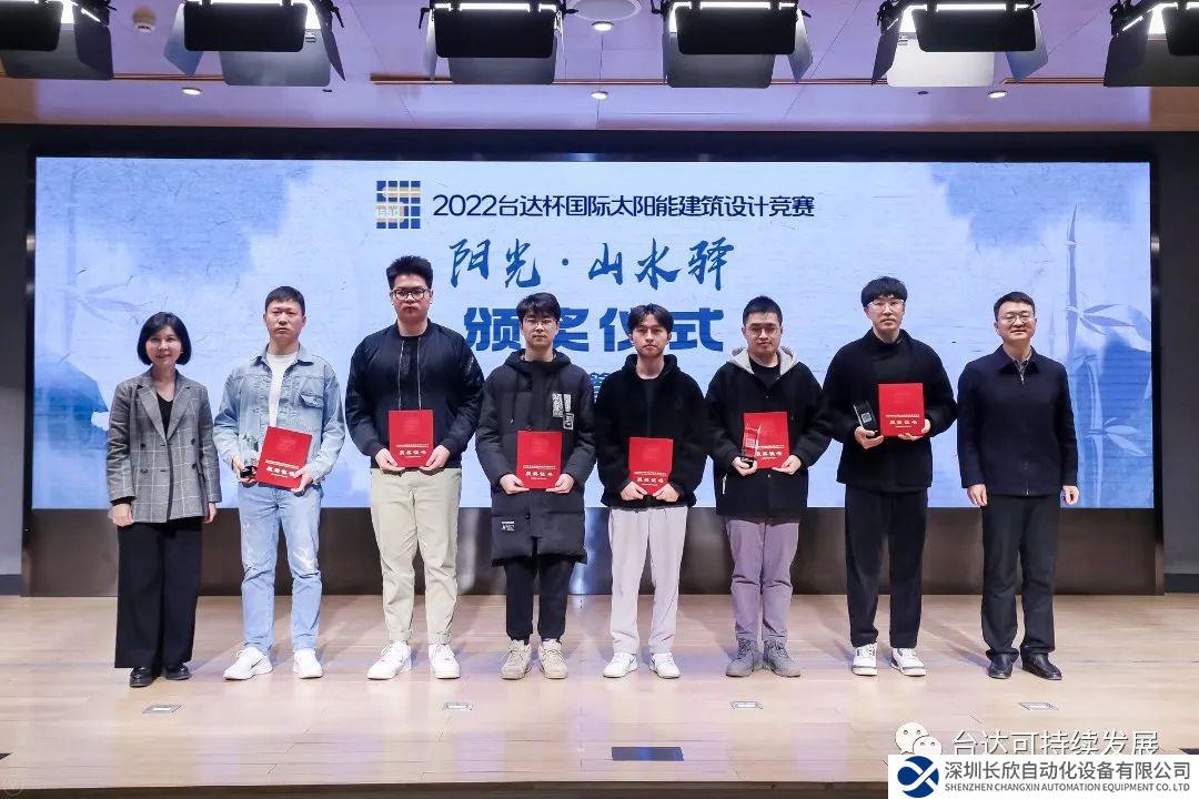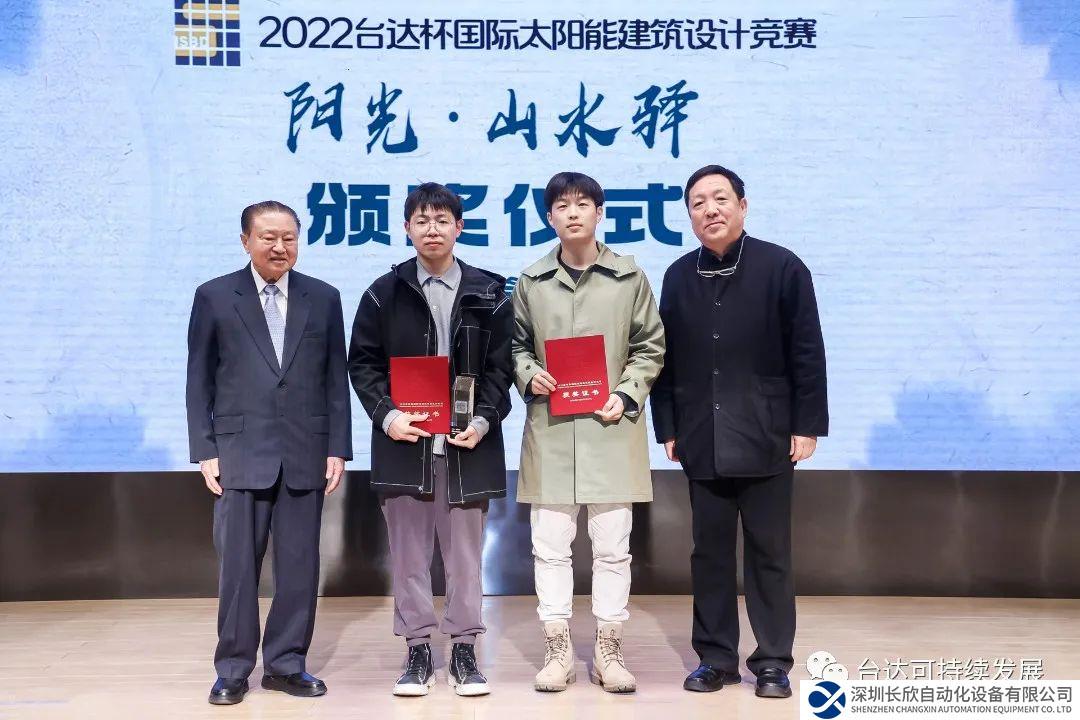 台达创办人郑崇华先生(左一)与中国工程院院士崔愷先生(右一)为2022台达杯国际太阳能建筑设计竞赛一等奖团队颁奖。