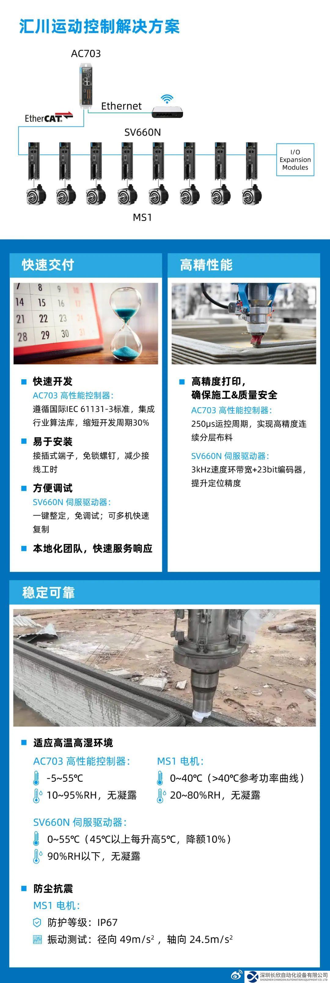 汇川运动控制解决方案,不仅可以帮助3D建筑打印机呈现完美状态,同时亦适用于各式各样的大型建筑装备。面对日益激烈的全球化市场竞争,汇川将不断突破创新,助力建筑装备企业在全球战略中保持领先地位。