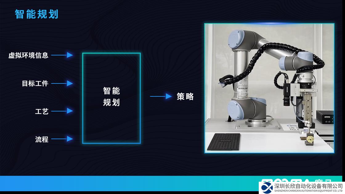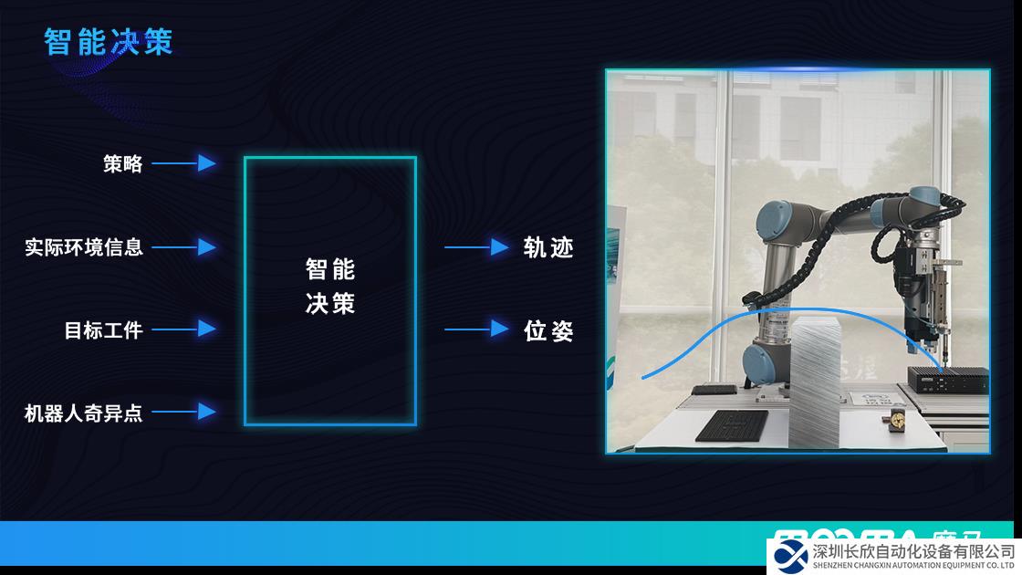 智能决策,机械臂大脑通过智能规划输出的策略,根据现实环境自主决策机械臂在该环境中的最优轨迹和位姿。无需人工调试。不仅极大缩短了机器人的部署时间,更为机器人赋予柔性作业的能力。