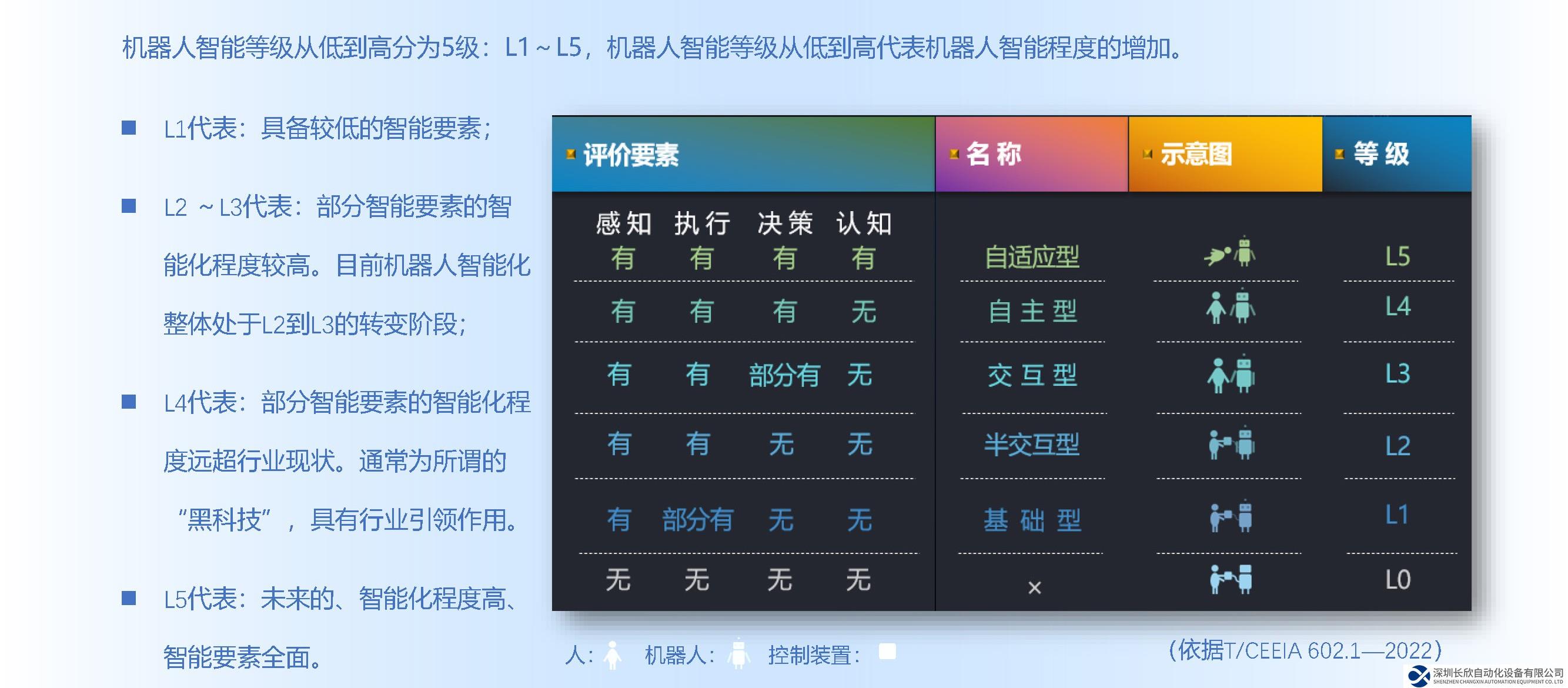 机器人智能等级测评标准是国家机器人检测与评定中心总部颁布,由国内外行业组织、专家共同研制,共分为“L1-L5”从低到高5个智能等级,分别代表“基础型”、“半交互型”、“交互型”、“自主型”、“自适应型”5个智能等级。这与汽车行业的无人驾驶技术的L1辅助驾驶到L5无人驾驶,有着异曲同工之处。而机器人智能化等级中又包含4个要素,感知、认知、决策、执行,要素的等级越高,代表着机器人的智能化程度越高。