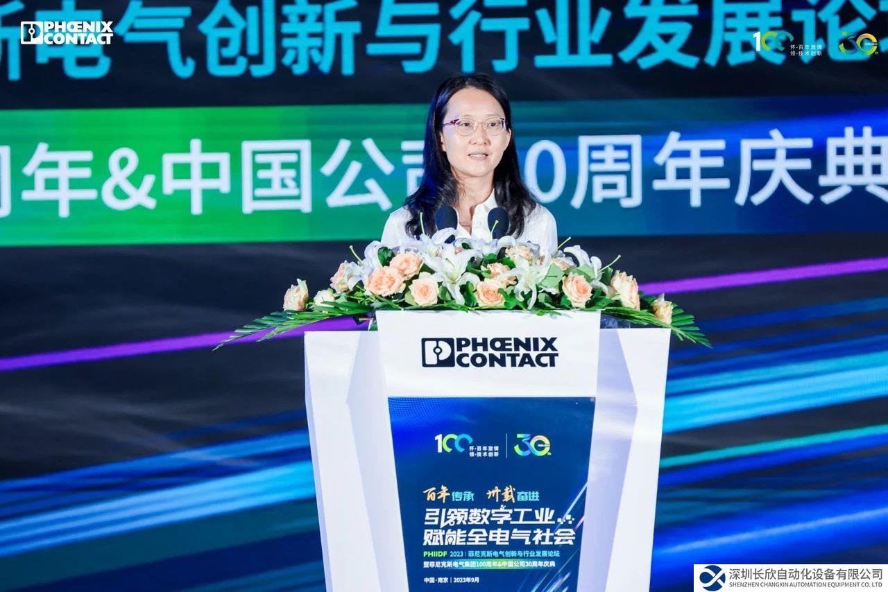 南瑞集团总会计师、党委委员魏蓉女士代表南瑞对菲尼克斯电气中国公司和员工表示祝贺,向关心支持中国公司的政府领导、客户、伙伴表示感谢。南瑞和菲尼克斯电气共同经历了创业、成长、发展的历程,互相尊重和信任。三十而立,向阳出发,南瑞期待与菲尼克斯电气携手再创辉煌,再谱新篇。