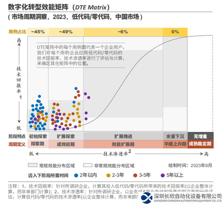 中国低代码/零代码拥有较大的待开掘机会空间;从DTE矩阵的周期定义来看,现阶段的大部分实践者处于探索期和成效初期阶段。