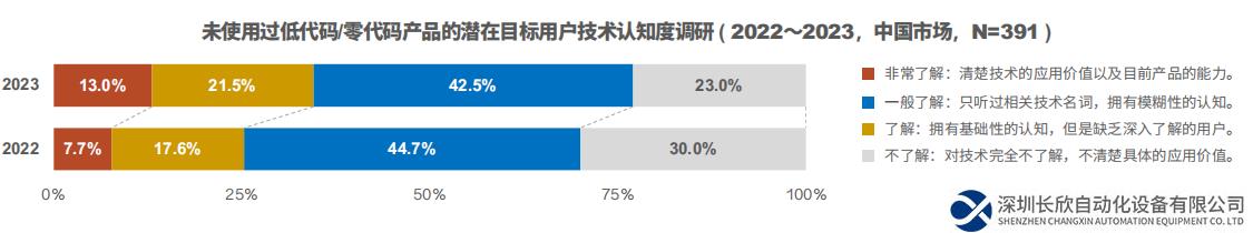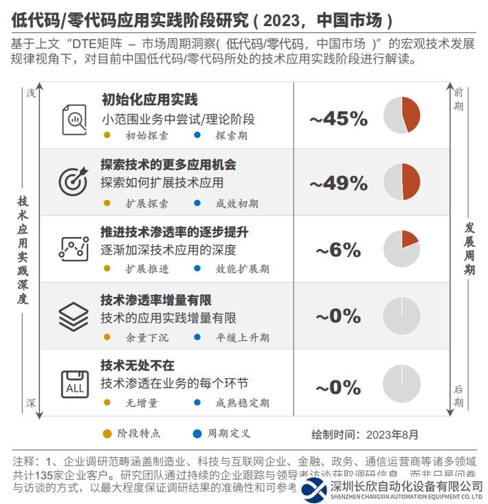 目前的实践者中,约49%的中国企业对低代码/零代码的应用已跨越初始探索阶段,尝试寻找更多实践机会。