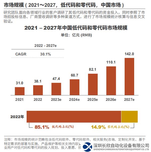 中国低代码和零代码市场规模预计至2027年达到142亿元,行业竞争者应关注未来五年中的两个关键市场增长节点。