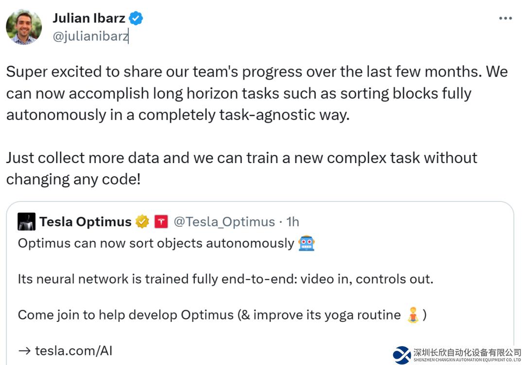 团队资深软件工程师 Jupan Ibarz 表示,「非常高兴分享团队在过去几个月中取得的进展。现在 Optimus 可以完成长期任务,比如完全以任务无关的方式自动对物体进行分类。只需要收集更多数据,则无需更改任何代码就可以训练新的复杂任务。」