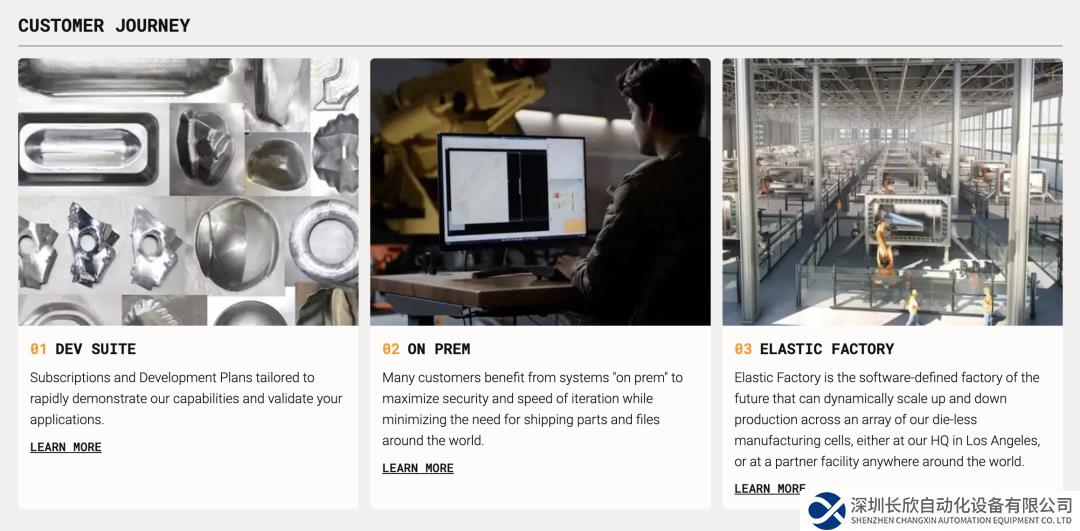 Machina Labs 设计了不同的商业模式和产品线,以降低进入壁垒,为多种类型的公司以及从概念到生产到维护的产品开发的各个阶段创造灵活性;从 DEV SUITE 开始进行概念验证、原型和新应用程序开发,客户可以在 Machina Labs 的设施中部署 ON PREM 系统,从而扩大内部生产规模或进行弹性工厂生产。