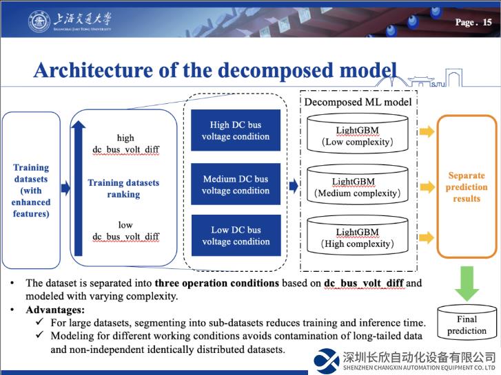 面对赛题所给出的海量低质数据,甘子毅、吴舜禹同学在与导师多次讨论后,决定以多工况为切入点,通过特征挖掘对IGBT运行工况进行划分,再对应设计不同复杂度的机器学习模型。实验结果表明,所提出的分解预测模型可以在大数据集中显著加快训练和推理速度,并同时兼顾了预测精度。