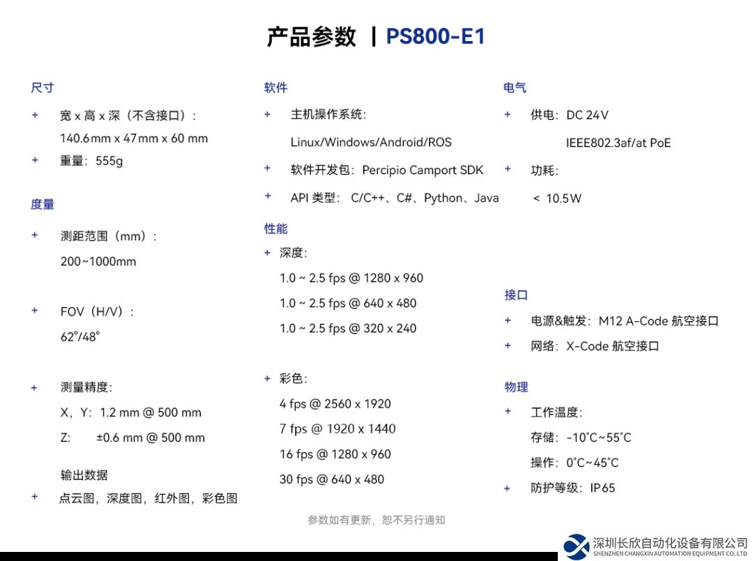 PS800近视场精度为XY:0.5@200mm,Z:±0.1@200mm;远视场精度为XY:2.35@1000mm, Z:±2.3@1000mm。提供了散斑结构光技术路线下的最高精度性能。