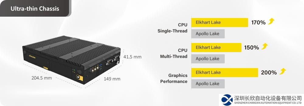 P1201作为一款超薄型嵌入式电脑,其体积仅204.5 x 149 x 41.5 mm,非常适合安装在AMR狭小的空间里。在性能方面,搭载Intel® Elkhart Lake平台的Atom® x6425E四核心处理器,相较于上一代平台(Apollo Lake),单核运算效能提升高达1.7倍,多核运算效能提升1.5倍,并支持高达3200 MHz DDR4 32GB内存,仅6或12W TDP的超低功耗,有效减少AMR的充电时间,大幅提高生产效率和生产力。