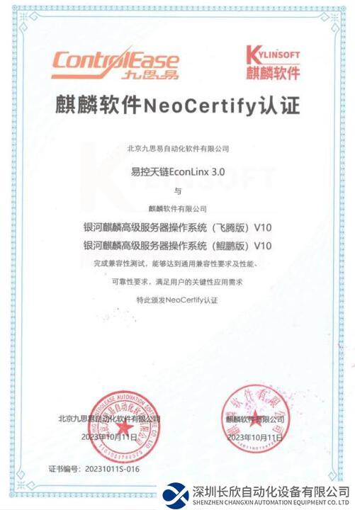 日前,九思易自动化软件公司的易控天链EconLinx3.0产品与欧拉开源操作系统(openEuler简称“欧拉”)完成相互兼容性测试;与华为技术有限公司Kunpeng920完成并通过相互兼容性测试认证;并与麒麟软件有限公司的银河麒麟高级服务器操作系统(飞腾版、鲲鹏版)V10完成兼容性测试。