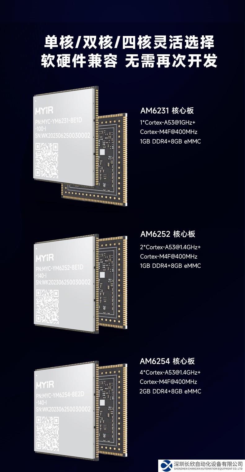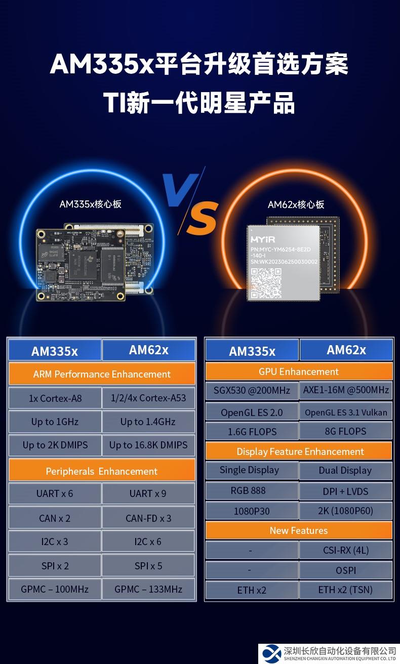 在过去的十几年中,TI Sitara系列推出了很多优秀的处理器,其中在工业、电力、医疗等领域有着广泛应用的AM335x系列处理器,引领工业市场从MCU向MPU演进,帮助产业界从ARM9迅速迁移至高性能Cortex-A8处理器,成为一代经典!随着工业4.0的发展,人机交互、工业控制、医疗、新能源等领域的应用在处理器性能、外设资源、功耗、显示及安全等方面面临迫切的升级需求。为此,TI推出全新一代工业级MPU AM62x处理器,相较于上一代AM335x,AM62x在工艺、内核、外设、显示、安全等方面实现性能大升级,推动人机交互、工业控制、医疗、能源电力等应用的智能化发展。 米尔电子基于TI AM62x核心板仍然以更优惠的价格回馈市场,批量价格176元起,赋能新一代工业4.0升级。