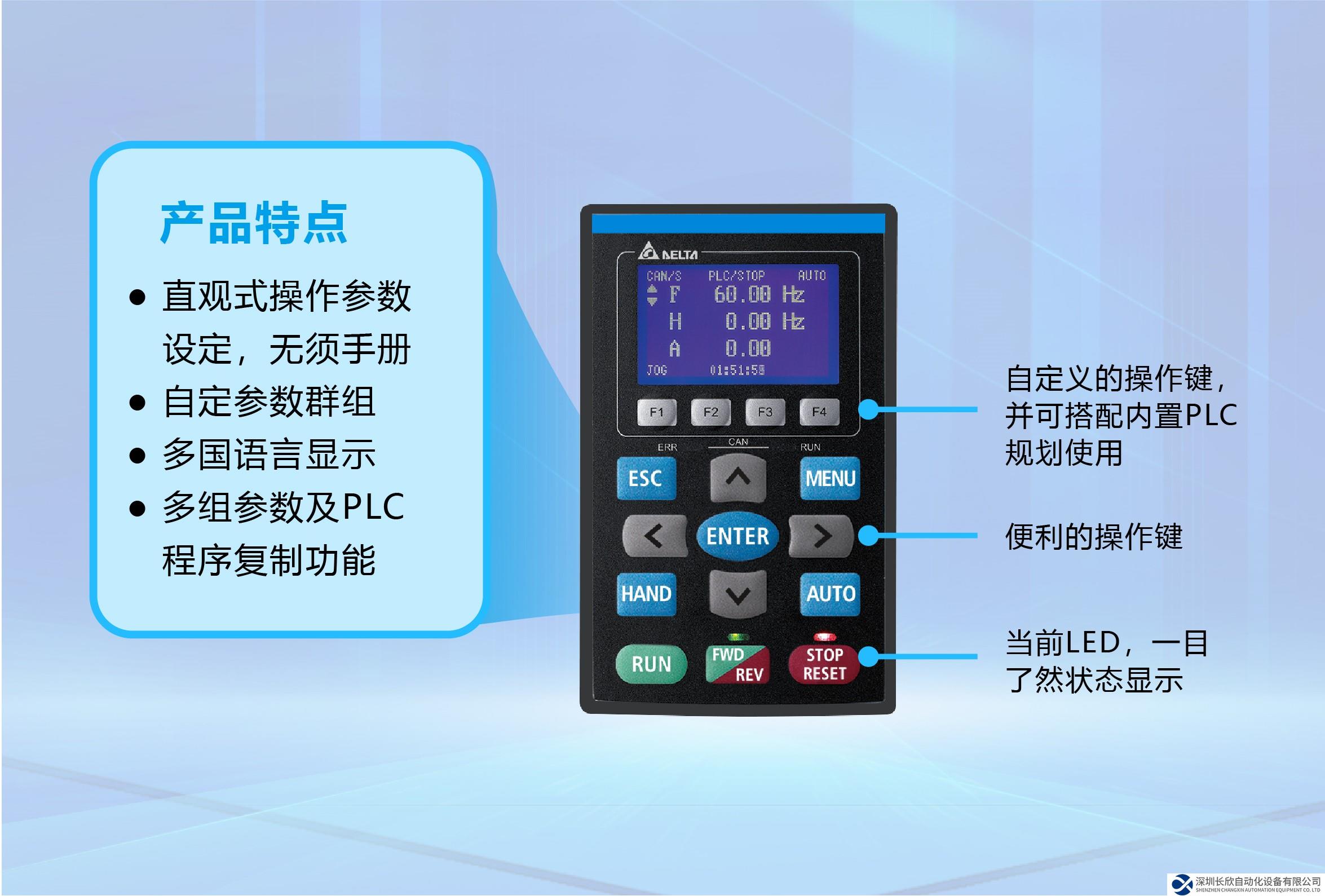 C2000 Plus搭配可视化LCD操作面板,操作方便;内置行业参数组合功能,可直接选择应用并浏览参数,轻松完成参数设定。