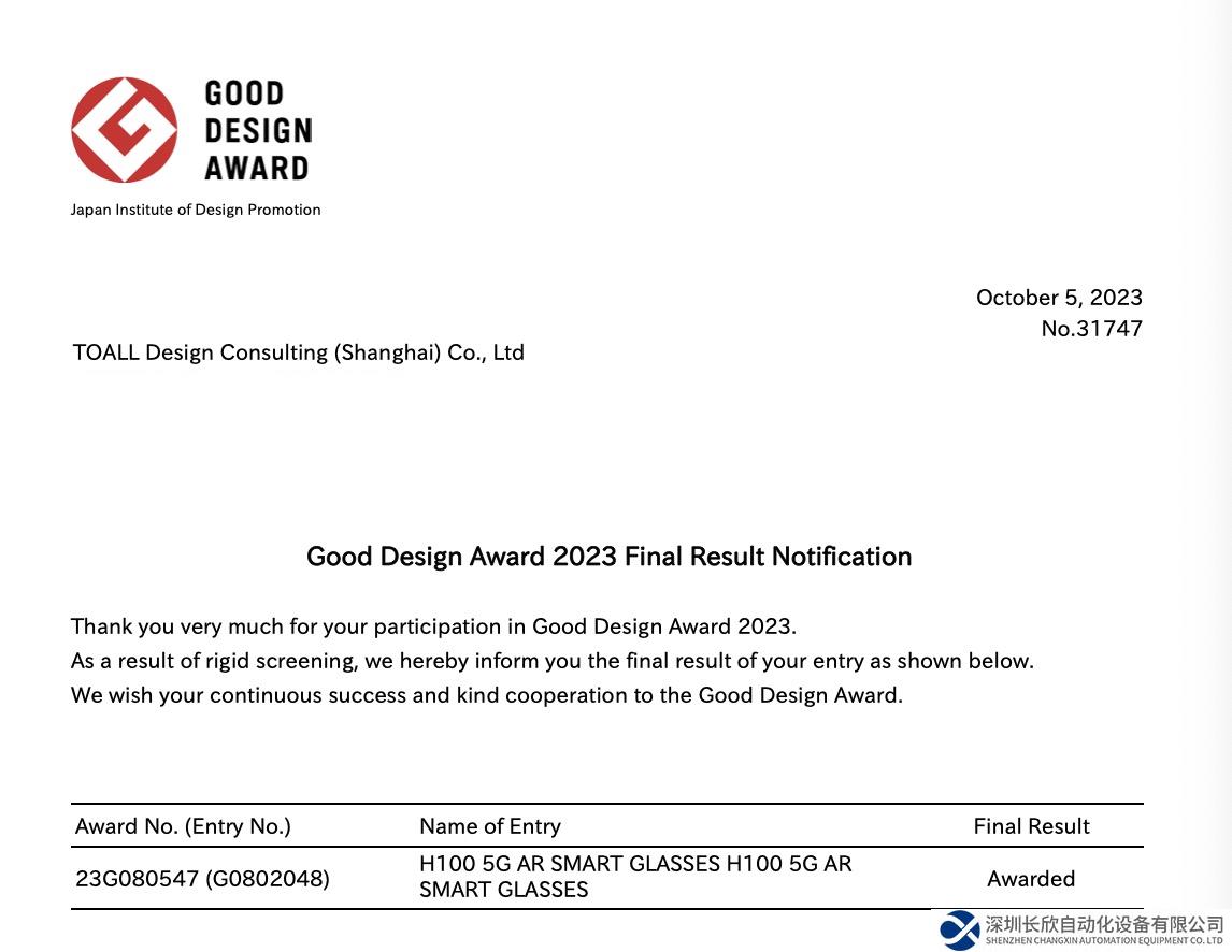 近日世界顶级设计奖之一GOOD DESIGN AWARD已于10月5日公布了2023年度获奖者名单。 TOALL凸凹设计的HiAR H100 5G AR SMART GLASSES在全球5447件参赛作品中脱颖而出,荣获GOOD DESIGN AWARD 2023年度的优秀设计奖。