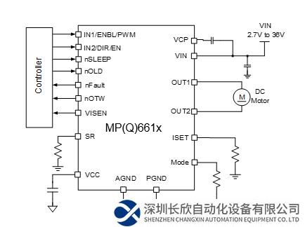 汽车级全桥马达驱动 MPQ661x,具有2.7V-36V 输入电压,8A 连续输出电流,内部全H-桥驱动可支持 100% 占空比,MOSFET 导通电阻: HS+LS= 40mΩ,多种MODE可选,如输入 PWM/DIR、IN1/IN2、独立-PWM、并联等设置模式,可兼容 3.3V 和 5V 逻辑电源。