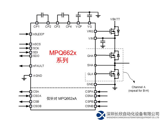 在车身控制方面,MPS的8路PWM汽车级驱动MPQ662x系列产品,具有6V-40V 输入电压和64mA 栅极驱动电流,可以同时驱动4个有刷电机,集成性非常强。另外,它还提供SPI串联控制接口,其 Charge pump 可用于实现外部 N-MOS 防反电池保护和实现高端栅极驱动支持 100% 占空比 ,而8路PWM可以极大简化用户的设计。