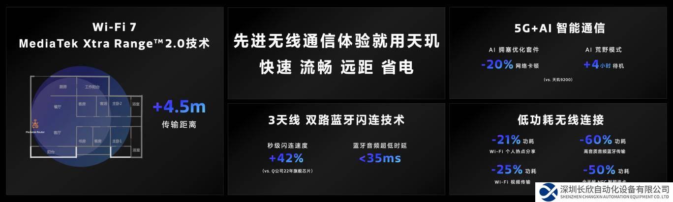 在连接方面,天玑9300支持Wi-Fi 7,最高理论峰值速率可达6.5Gbps,同时搭载联发科特有的Wi-Fi 7增强技术。MediaTek Xtra Range 2.0 技术让Wi-Fi 7超广覆盖,并且可以提升设备间传输数据的速度和抗干扰的能力。此外,天玑9300最高还可支持3个蓝牙天线,结合特有双路蓝牙闪连技术,让蓝牙设备的匹配速度更快,音频时延超低。