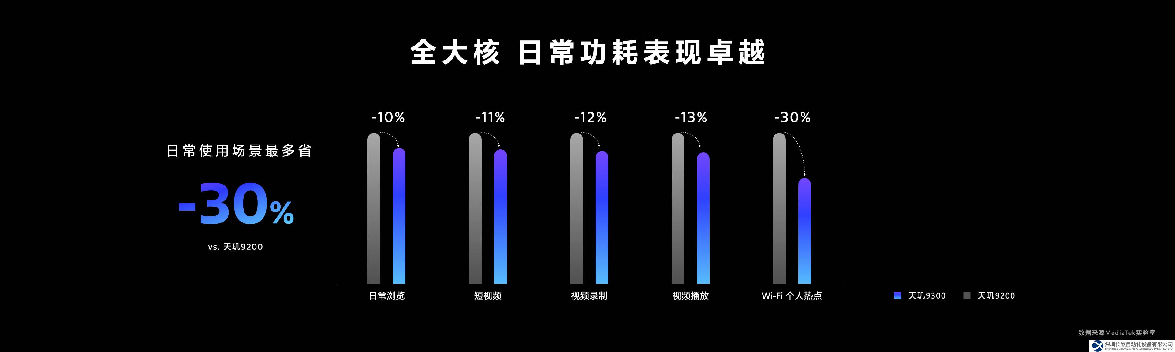 天玑9300能效好的这么离谱,就是因为全大核CPU架构性能强,效率高,可以更快地处理完工作后更早的休息,把性能通过最高效的调度用在最需要的任务上。也因此,天玑9300的日常能效提升巨大,日常浏览、短视频、开Wi-Fi热点等场景功耗最多降低30%。天玑9300表现这么好的全大核CPU架构,不仅超过了隔壁8G3,也干倒了A17 Pro,说明这就是未来的趋势,全大核是未来几年的旗舰标配。