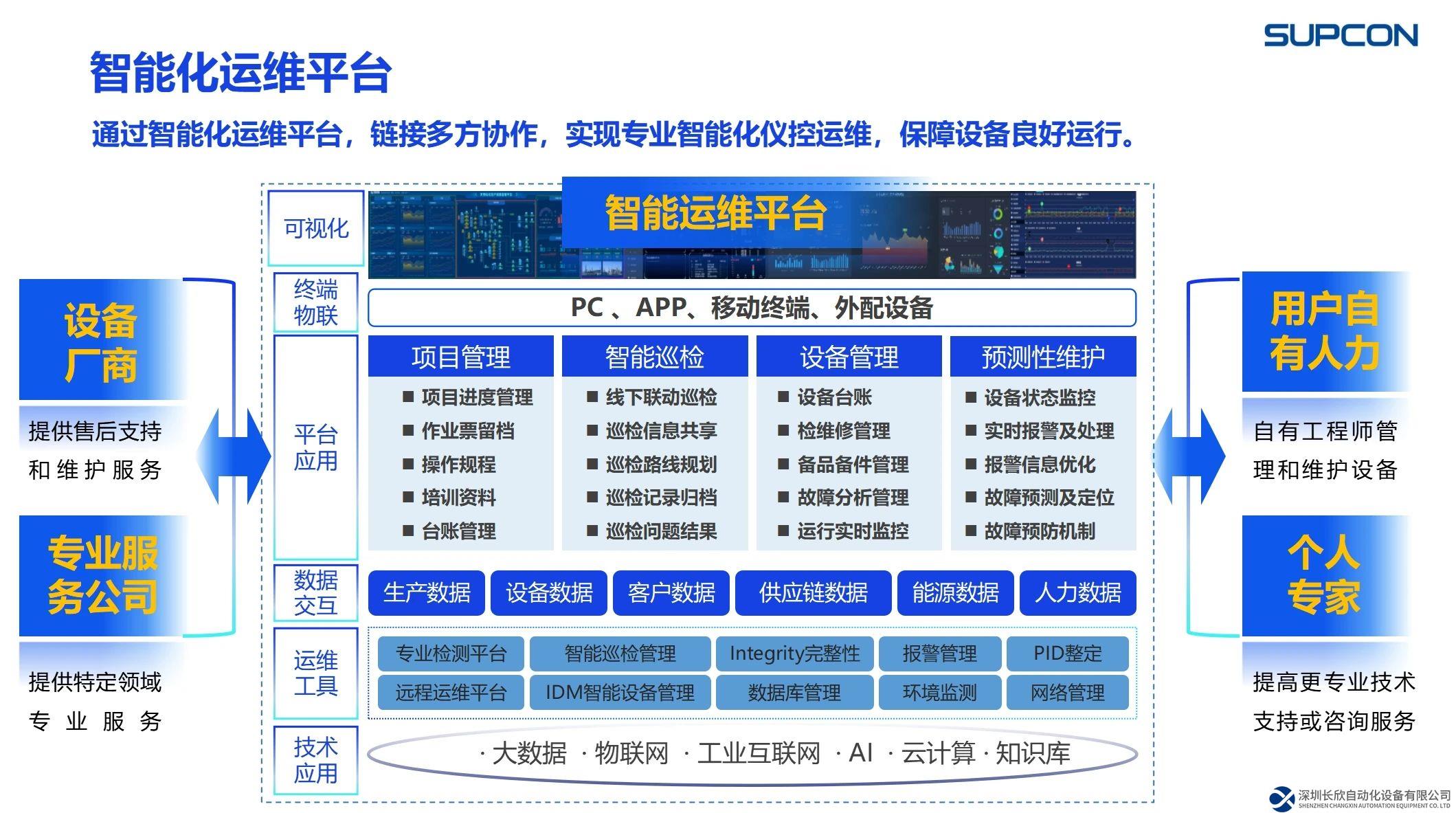 应用大数据、物联网、AI等先进技术,打造智能化运维平台和工具,开发智能化应用,实现数据交互,智能互联,智能分析生产运营决策,链接设备厂商、专业服务公司、企业用户、个人专家等多方协作,从而达到专业智能化仪控运维,保障设备良好运行。