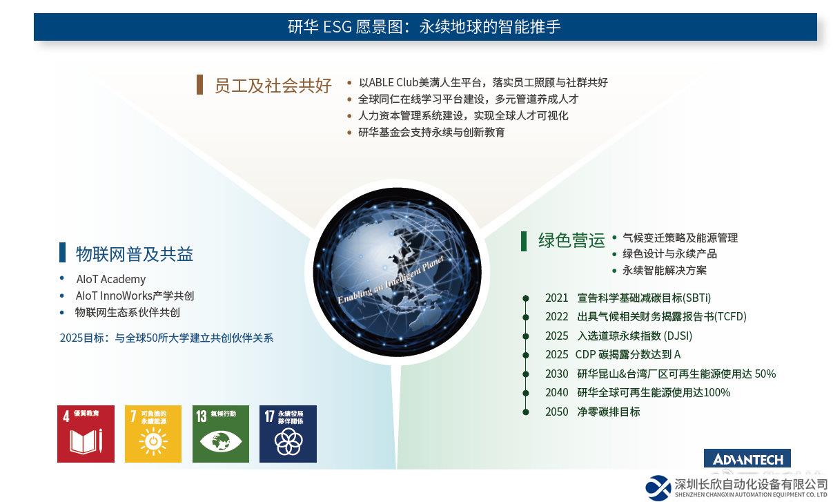 研华综合经营管理总经理陈清熙表示,研华近年制定“永续地球的智能推手”作为ESG发展愿景,为加速全球能源的零碳转型,于今年6月正式成为RE100会员,更在企业永续发展委员会通过2040年达成全球运营据点100%使用再生能源、2050年达成净零的两大目标。同时,也积极结合企业核心产业发展各项永续智能解决方案,包括智慧能源、智能医疗、智慧工厂、智能交通等,与产业链生态系伙伴共创合作。2022年来自永续产品营收的比例也超过18%,以真正落实企业核心能力结合可持续发展目标,平衡发展ESG三方面。