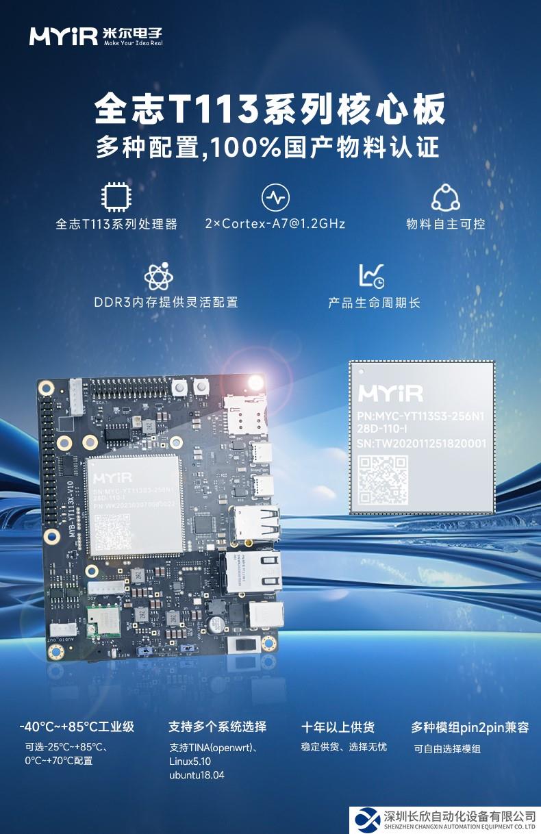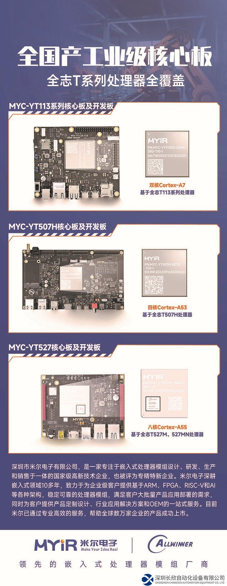 MYC-YT113X核心板及开发板,采用全志T113芯片,配备双核Cortex-A7处理器。全志T113系列芯片是目前比较受欢迎的国产入门级嵌入式工业芯片。米尔是基于T113芯片开发较早、提供配置最全的厂家,是目前唯一一家提供T113-S和T113-i两种芯片核心板的厂家。此外,T113-i的核心板兼容T113-S的核心板,同一个硬件设计,有多种更适合的选择。2种芯片,6种配置,选择多样。