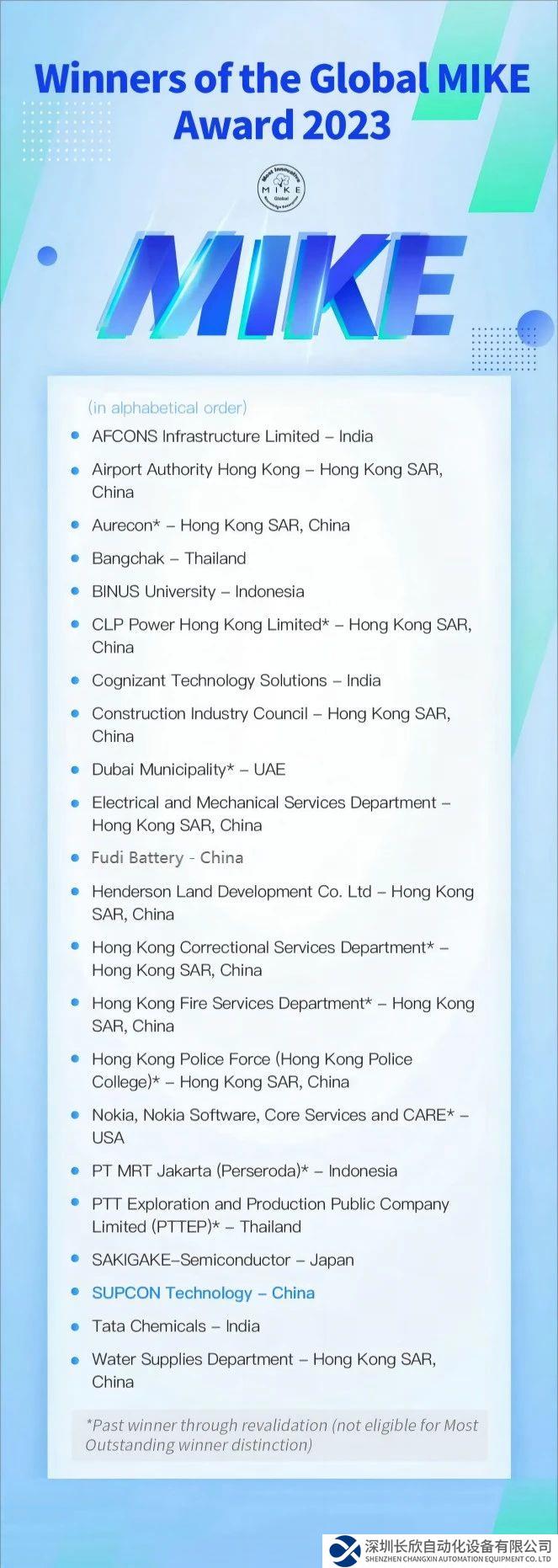 在2023年的全球MIKE大奖评选中,共有八个国家/地区参与,包括中国(内地)、中国香港、印度、印度尼西亚、日本、泰国、阿联酋和美国。经过严格的评选,共有22家组织脱颖而出,荣获2023全球MIKE大奖。在获奖的22家组织中,仅有2家来自中国内地,其中中控技术是其中之一。此外,Google、Amazon、Apple、Microsoft等国际知名企业也曾获得该奖项。