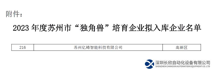 近日,苏州市科学技术局公布了2023年度苏州市“独角兽”培育企业拟入库企业名单并于1月2日结束公示,亿铸科技荣获市级“独角兽”培育企业资格认证。