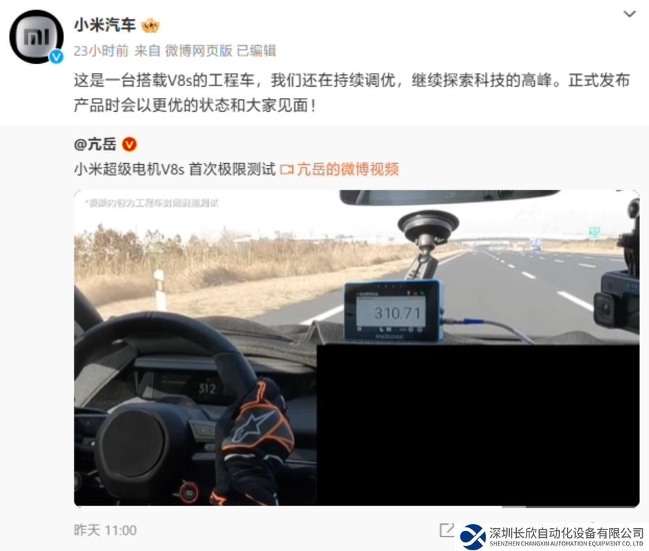 综合IT之家此前报道,博主 @亢岳 发布了视频《小米超级电机 V8s 首次性能测试》,搭载该电机的测试车最高时速达到了 311.73km/h,汽车仪表盘本体显示的速度则为 313km/h。