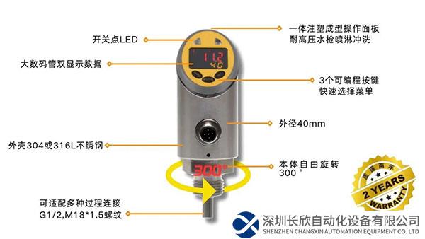 新款传感器的亮点之一是其集成的 IO-Link 通信功能,它提供了包括 IO-Link 参数设置和按键设置在内的多种操作方式,增加了使用的灵活性。标准化的传感器接口,兼容国际标准,特别是 M12 接口的第 4 针的双重功能设计,既能作为 IO-Link 通信,也能作为开关量输出,极大地提高了产品的适用范围。