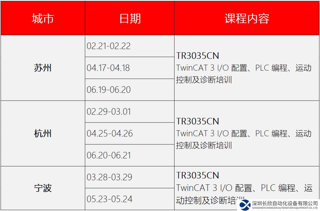 为了便利长三角地区的客户,倍福将从今年开始每月在华东不同城市举行培训课程。2024 年上半年江浙地区培训计划新鲜出炉,王牌课程:TwinCAT 3 入门培训,涵盖了 TwinCAT 3 I/O 配置、PLC 编程、运动控制及诊断培训等内容。