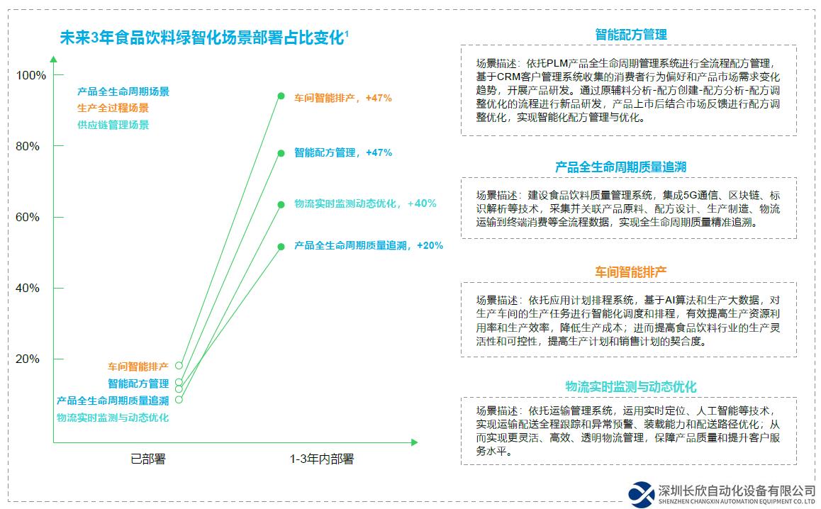 在食品饮料行业,面临着诸多挑战:多样化的产品种类、高要求的产品安全性以及快速迭代的产品周期。为应对这些挑战,企业在工艺设计、计划调度、仓储配送和供应链物流交付等方面进行投入,以满足不断变化的消费者需求。由于消费者需求转向速度快,传统产品开发难以迅速响应,数字化手段成为重要工具,特别是通过全流程管理提高研发效率和产品质量。报告调研数据显示,智能配方管理、车间智能排产和物流实时监测与动态优化三类场景未来3年内部署占比均超过50%,场景部署增量平均在40%及以上。