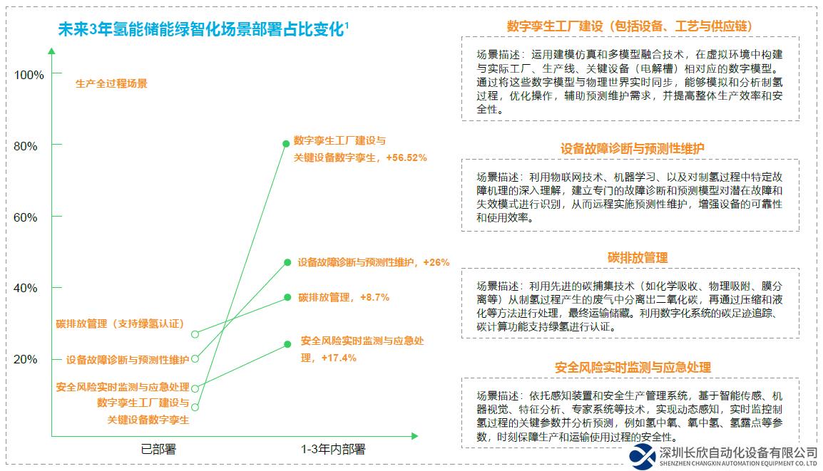 以氢能储能行业为例,上游环节,氢气易燃易爆、密度低,导致储氢设施建造成本相对较高,另外氢气在储存和运输时一旦泄漏,容易导致爆炸,后果严重,所以需要在虚拟环境中创建和测试基础设施的可靠性,同时模拟生产与运输时极端环境造成的危害,制定安全应对策略;下游环节,氢气的应用客户对于氢气纯度有严格要求,例如燃料电池需要5N纯度,但传统自动化技术无法保障产品纯度,需要在线对氢中氧、氧中氢、氢露点进行监测&helpp;&helpp;这些挑战使得安全风险实时监测与应急处理、数字孪生工厂建设与关键设备数字孪生、设备故障诊断与预测性维护、碳排放管理与追踪等成为企业优先关注的数字化场景。