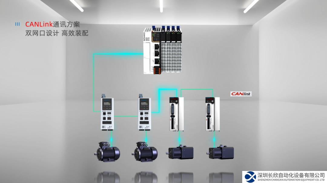 针对小型自动化设备,MD600可与伺服、PLC实现CANLink通讯方案。为提高组网接线效率,MD600采用双网口设计,标准网线轻松实现通讯组网,加上简易的通讯配置,让整个方案调试更加便捷。