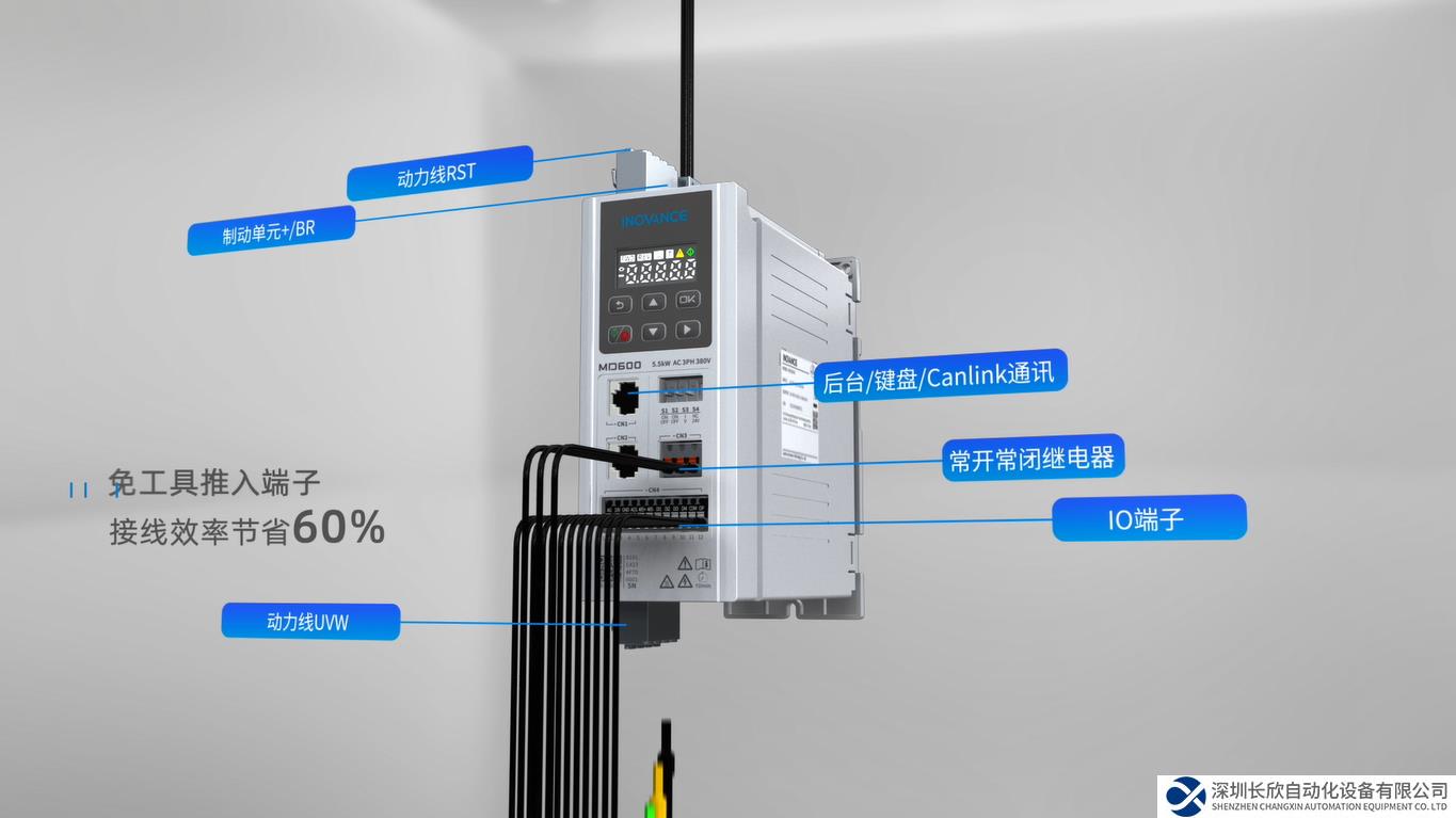 MD600从免工具安装的设计理念出发,针型线耳直接推入端子,控制线、动力线、通讯线端子均采用可插拔端子,整个过程无需紧固螺钉,避免了端子滑牙的风险,装配效率可提升60%,减少人工成本,提高出货效率,实现整个工厂的精益化。