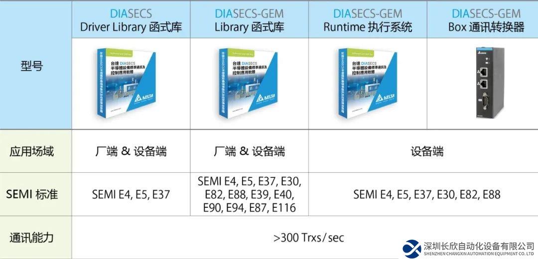 因应不同的使用场景及应用深度,台达的DIASECS 系列有四种产品可以选择:DIASECS Driver Library、DIASECS-GEM Library、DIASECS-GEM Runtime、DIASECS-GEM Box。
