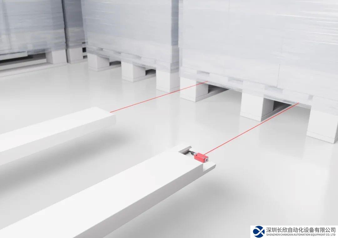 在自动引导车辆上,ODT3CL1-2M光学传感器监测托盘是否正确接收和转移。