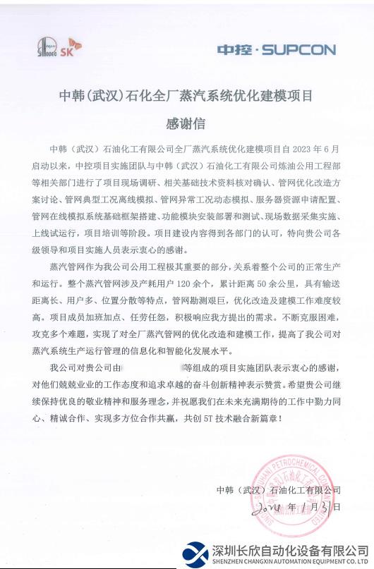 目前,该项目已成功落地并顺利通过验收,中韩石化向中控技术发来感谢信,对中控技术团队在全厂蒸汽系统优化建模项目中展现出的专业水准和敬业精神予以高度赞誉。一直以来,中控技术始终秉持自主创新的理念,致力于为客户创造价值,为行业攻克关键难题。展望未来,中控技术将继续携手合作伙伴深耕流程工业,在工艺优化、设备改造、智能运营、工业节能、生产模式提升等方面持续创新突破,共创低碳经济发展的美好未来。