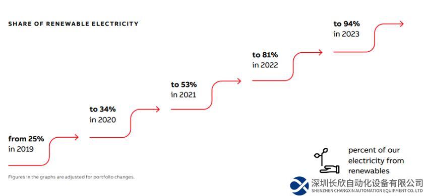 与2019年相比,ABB能耗降低了21%。到2023年底,ABB有64%的能源消耗和94%的电力来自于可再生能源。