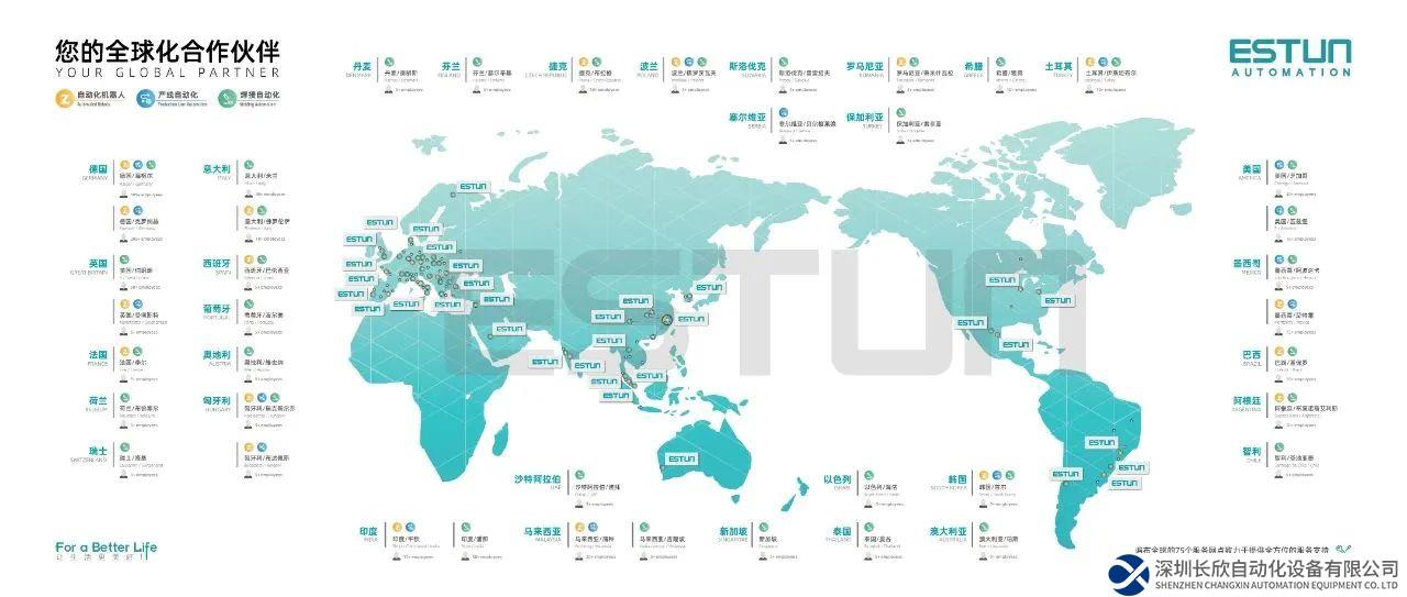 埃斯顿积极布局全球产业链,与合作伙伴携手,打造成长型合作生态圈,实现全球化的服务与支持。埃斯顿目前在全球拥有75个服务网点,拥有CE、UL等符合国际标准的安全认证,其中有52款覆盖3~700kg的工业机器人符合CE认证,在东南亚,欧洲,北美等国家和地区投入使用。