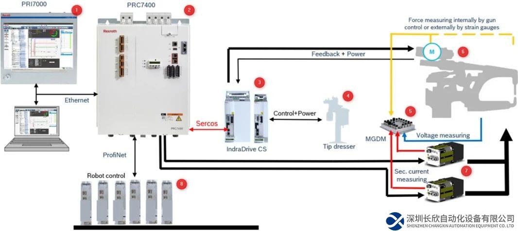 系统主要组成:1)PRI7000操作软件;2)PRC7000焊接控制器;3)HCS01伺服驱动器;4)修磨器;5)MGDM模块;6)电伺服焊钳-集成压力测量;7)中频变压器;8)点焊机器人。