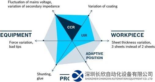 如下图所示,CCR为恒流焊接过程对质量的控制能力;UIR为电阻样本曲线的自适应焊接过程对焊点质量的控制能力;灰色的区域则是基于位移自适应的焊接过程,可以明显看出,其对点焊质量的控制调节能力范围几乎达到100%。