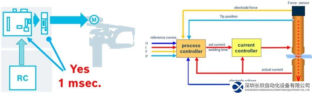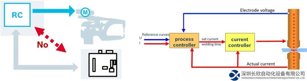 下图为目前传统的由机器人控制伺服焊钳的系统图,焊接控制器只能对焊接电流、电压、时间的参数进行控制。