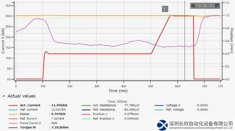 下图呈现了某点焊过程的恒压力焊接过程, 可以看出伺服电机的扭矩是变化的,传统的Robot控制伺服焊钳的压力控制,实际上是恒扭矩控制,点焊过程时,实际焊接压力是变化的,PRC7000控制伺服焊钳时,能实现真实的恒压力控制,从而精确控制焊点质量。