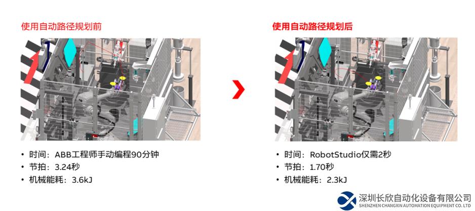 ABB RobotStudio软件在短短两秒内即可完成机器人动作的自动分析和规划,相较于人工操作,即熟练工程师花费近90分钟而言,效率得到显著提升。通过高效流畅的动作路径规划,它能够将生产节拍时间缩短近一半,并降低超过30%的能源消耗。