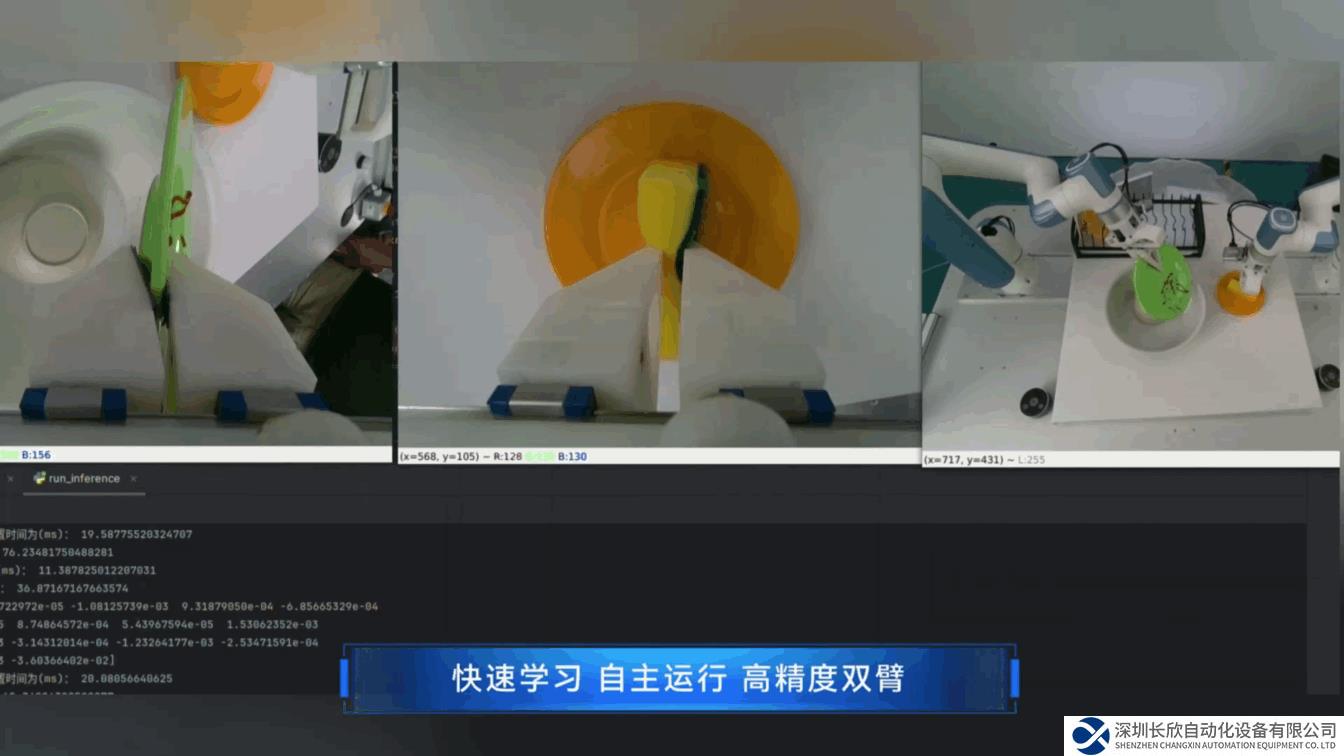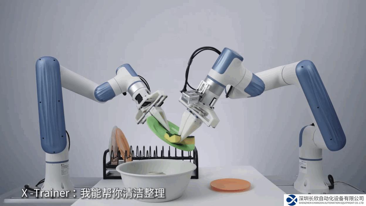 视频显示了 X-Trainer 采用模仿学习神经网络+ 视觉大语言模型,训练 2 小时,获得了自主刷盘子的能力,相较普遍的训练时长,节省了 70% 的训练时间。