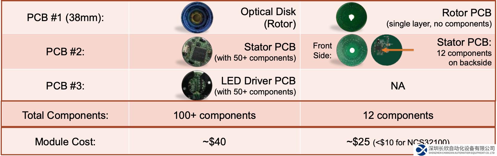 典型光学方案总共需要三块 PCB——光学圆盘、定子 PCB 和 LED 驱动器 PCB,实现全部功能需要大约 100 个器件。