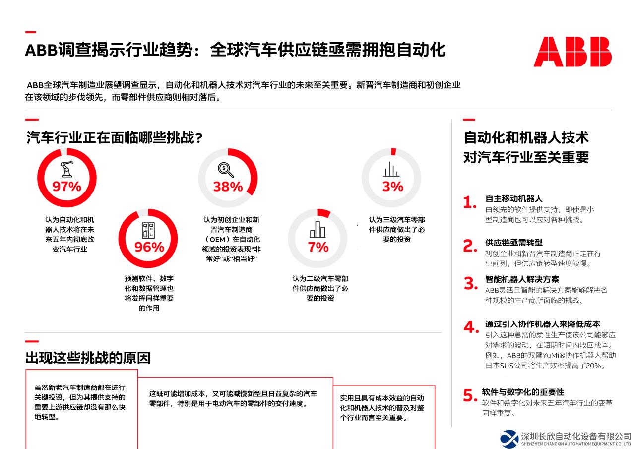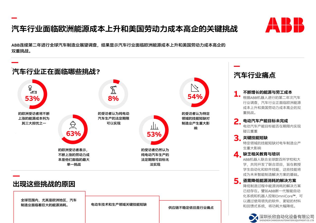 调查结果显示:全球汽车行业正面临欧洲能源成本上升和美国劳动力成本高企的双重挑战,汽车行业供应链中的许多企业仍有巨大的自动化空间,ABB节能的自动化解决方案可以有力助其应对这些挑战。