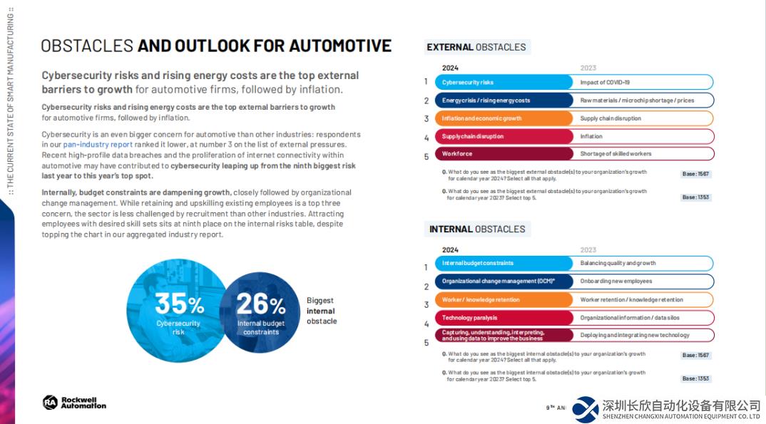 近日,作为工业自动化、信息化和数字化转型领域的全球领先企业之一,罗克韦尔自动化发布第九版年度《智能制造现状报告:汽车版》。这份全球调研共收到182位负责人的回复,覆盖来自15个主要制造业国家和地区的汽车制造商和汽车供应商。