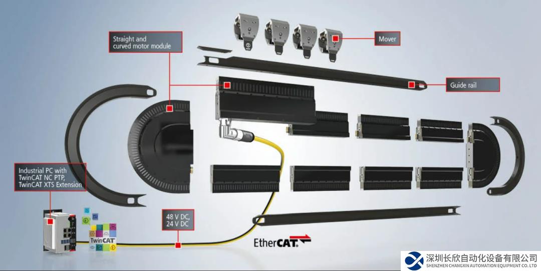 一套完整的模块化 XTS 系统由电机模块、导轨和动子,以及装有 TwinCAT 自动化软件的工业 PC 构成,可以根据具体的设备或系统布局进行调整。