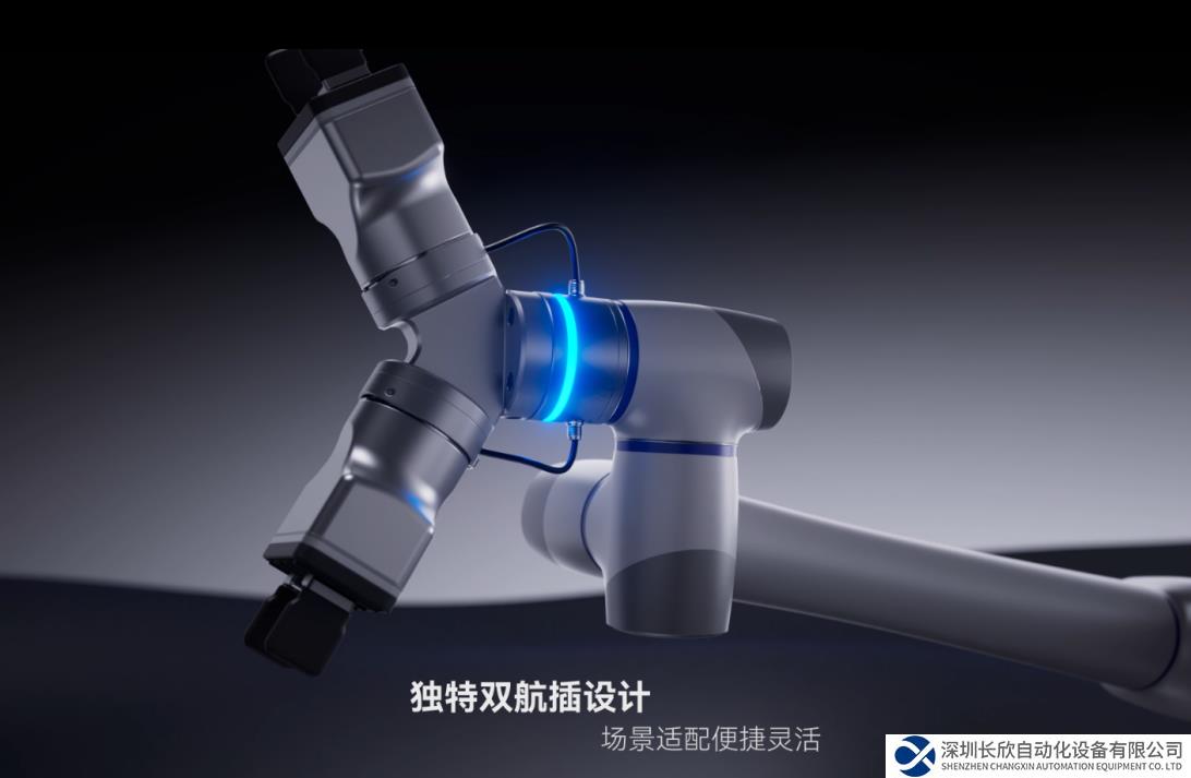灵活、易用是越疆产品设计的一贯理念,CR20A 采用业内首创的末端双航插设计,可直接连接多个末端工具,实现与生态组件的即插即用,摆脱复杂的线缆部署和机器人线束运动磨损等困扰。