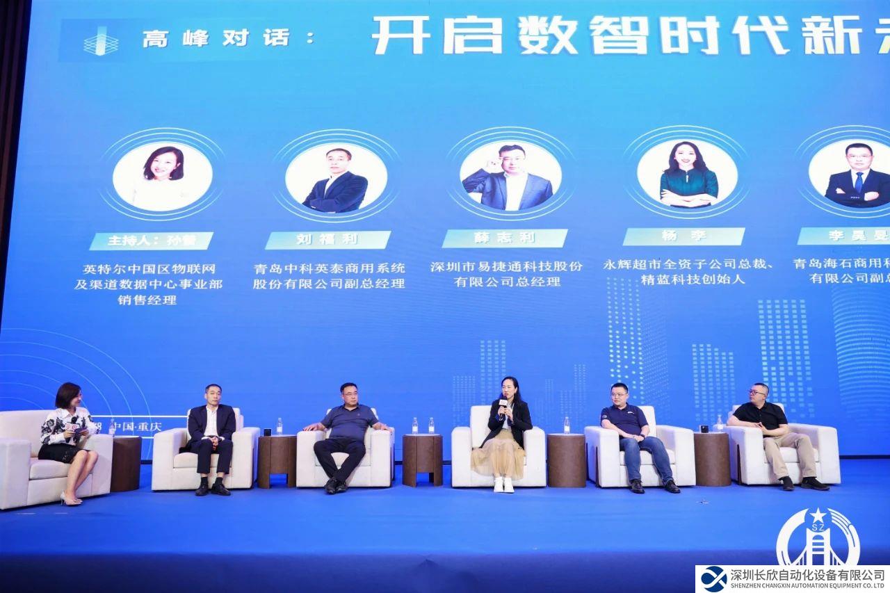 永辉超市全资子公司总裁、精蓝科技创始人杨李,深圳市易捷通科技股份有限公司总经理薛志利,青岛海石商用科技股份有限公司副总经理李昊旻,青岛中科英泰商用系统股份有限公司副总经理刘福利,深圳市吉方工控有限公司营销中心总经理李晓涛参与以“ 开启数智时代新未来”为主题的对话交流。